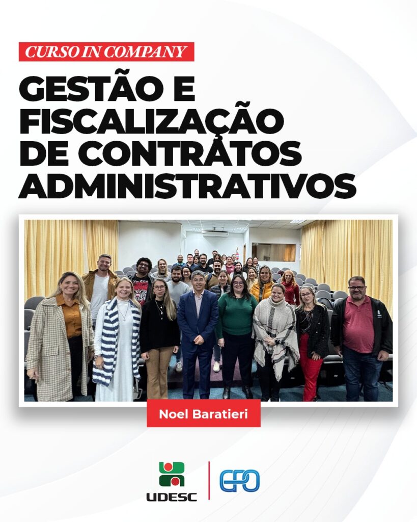 O advogado e professor Noel Baratieri ministrou o curso de capacitação intitulado “Gestão e Fiscalização de Contratos Administrativos”, para os servidores da Universidade do Estado de Santa Catarina (UDESC), nos dias 10 e 11 de junho deste ano, totalizando a carga horária de 16 horas/aula. Participaram do treinamento 40 servidores, todos envolvidos com as licitações e contratações públicas realizadas pela Universidade catarinense.